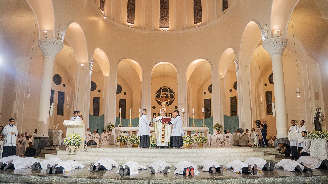 A Arquidiocese de Fortaleza celebrou, na última sexta-feira, 20 de dezembro, a ordenação diaconal de 13 seminaristas, em uma cerimônia solene na Catedral Metropolitana. A missa foi presidida por Dom Gregório Paixão, OSB, arcebispo metropolitano de Fortaleza e concelebrada por diversos padres, diáconos permanentes e bispos. Os ordenados escolheram o lema “Eu estou convosco, com aquele que serve” (Lc. 22,27), refletindo o compromisso com o serviço, a humildade e a dedicação à missão da Igreja.