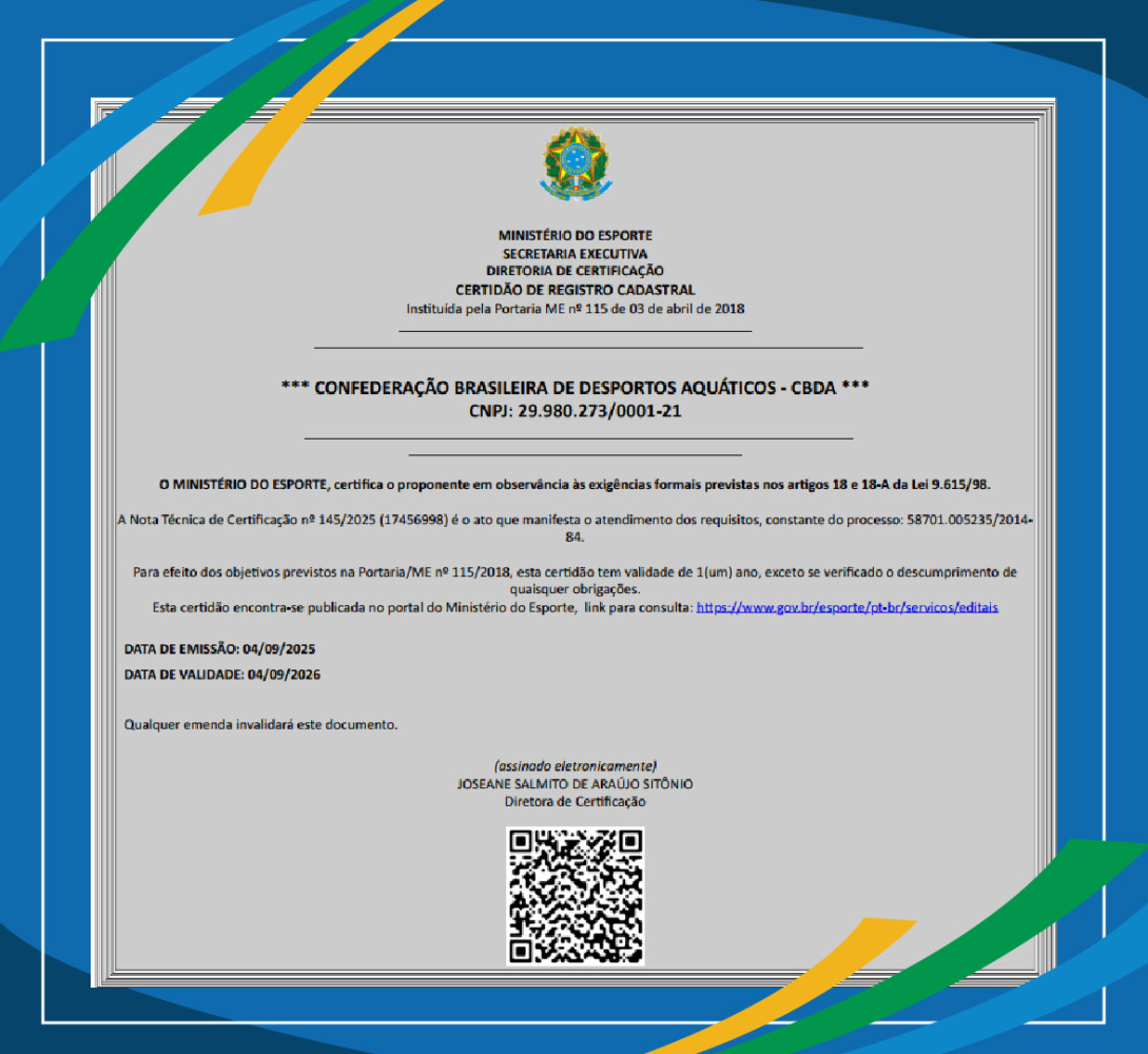A Confederação Brasileira de Desportos Aquáticos (CBDA) conquistou, nesta quinta-feira (4), a emissão das certidões 18 e 18-A – documentos que não eram obtidos pela entidade há vários anos. A regularização representa um marco importante para a gestão da confederação, permitindo novamente o acesso a recursos públicos essenciais para o desenvolvimento do esporte no país.