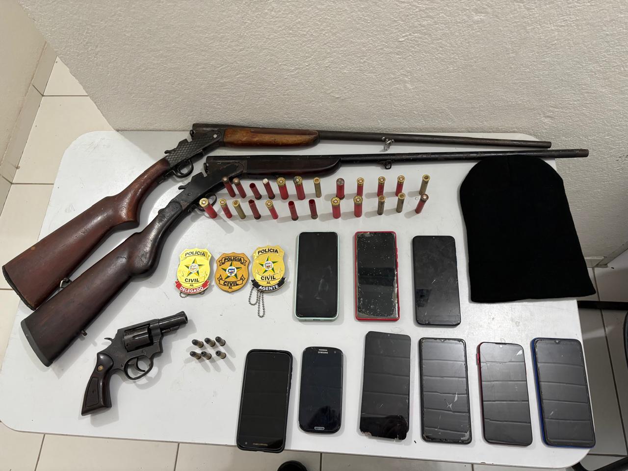 Durante o cumprimento dos mandados, os policiais localizaram com um dos investigados um revólver, possivelmente utilizado no crime, além de uma espingarda e munições. Diante do flagrante, foi lavrado auto de prisão por porte ilegal de arma de fogo.