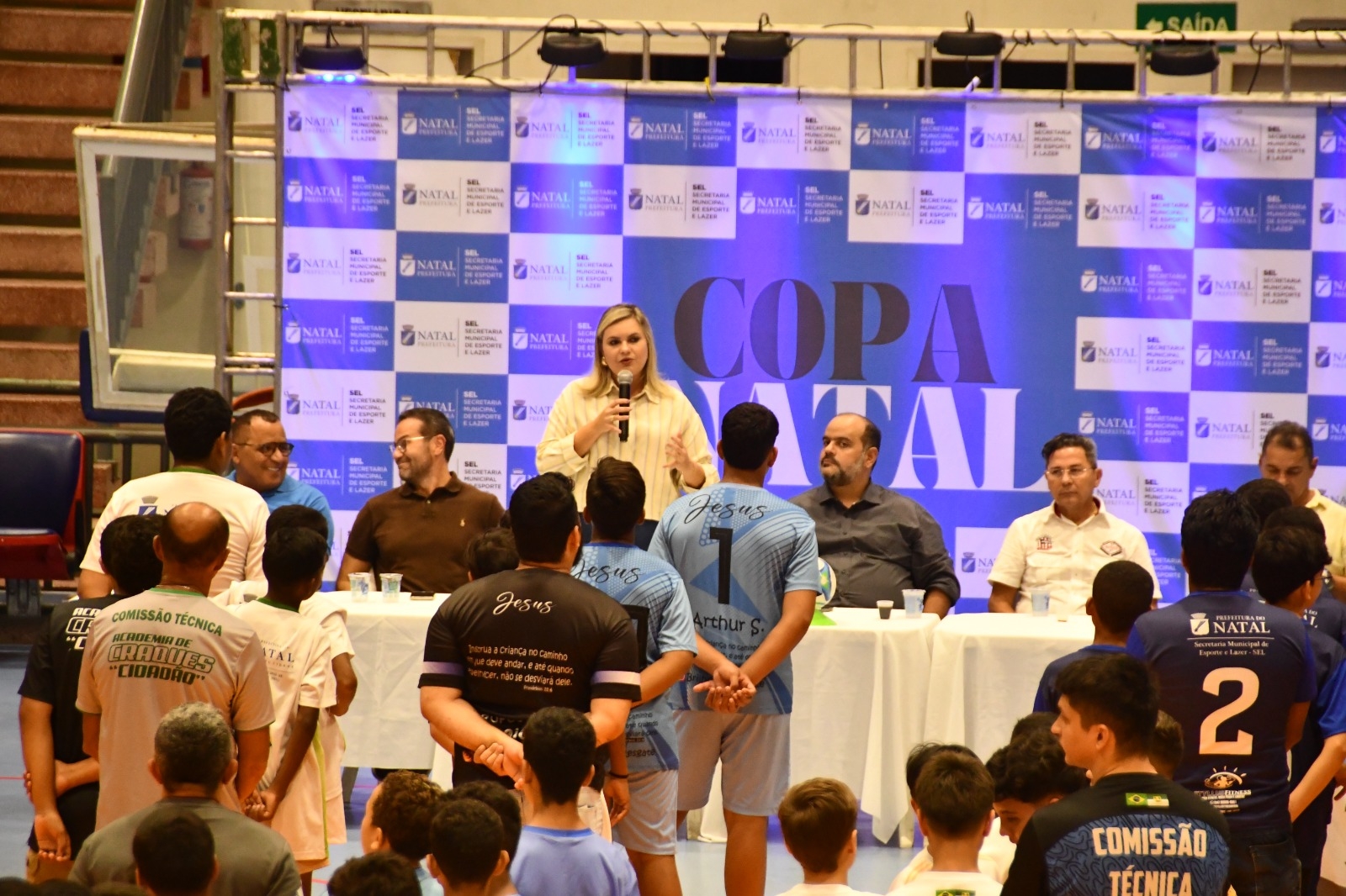 Jovens atletas de futsal do município participaram, na tarde desta terça-feira (8), da solenidade de abertura da Copa Natal de Futsal Sub-13 Masculino 2025. O evento foi realizado no Palácio dos Esportes e é uma iniciativa da Prefeitura do Natal através da Secretaria Municipal de Esporte e Lazer (Sel).