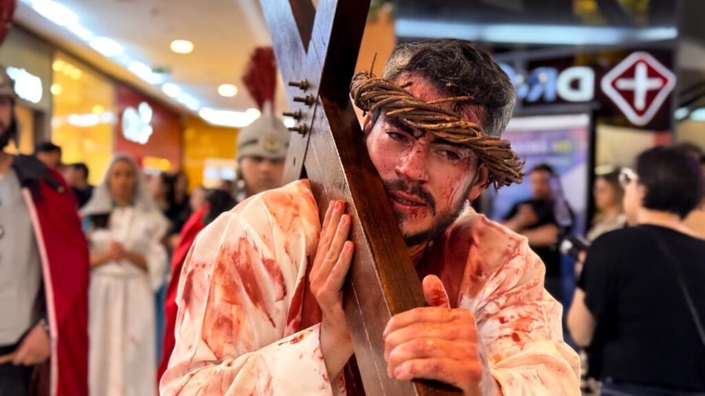 No último domingo (10), quem passou pelos corredores de um shopping localizado no bairro Mangabeiras, em Maceió, foi surpreendido por um momento de fé, emoção e reflexão. Jovens da Paróquia Divino Espírito Santo, do bairro da Jatiúca, realizaram uma pequena demonstração da tradicional encenação da Via-Sacra, chamando a atenção do público e proporcionando um instante de silêncio e espiritualidade em meio ao movimento do centro de compras.